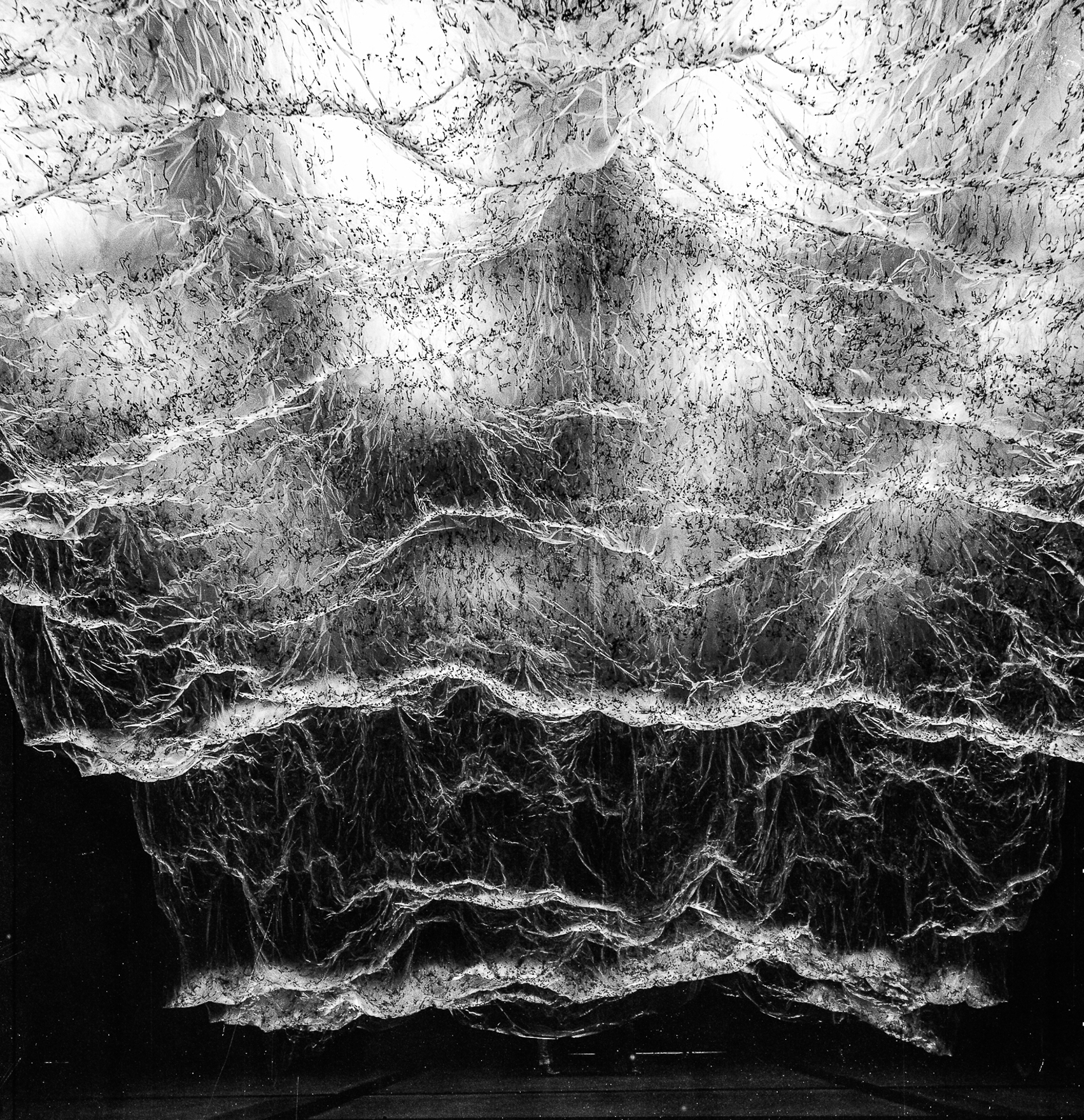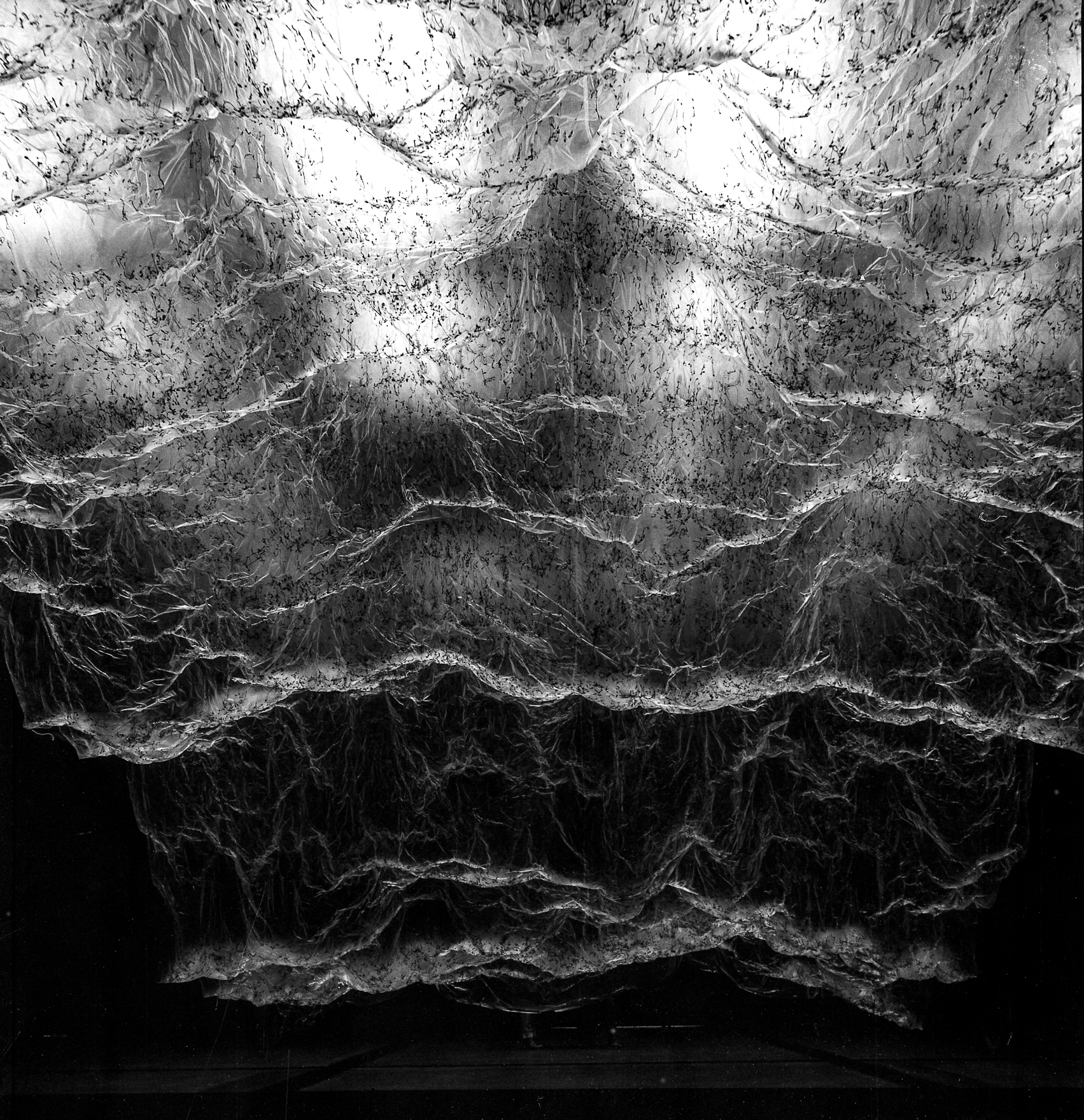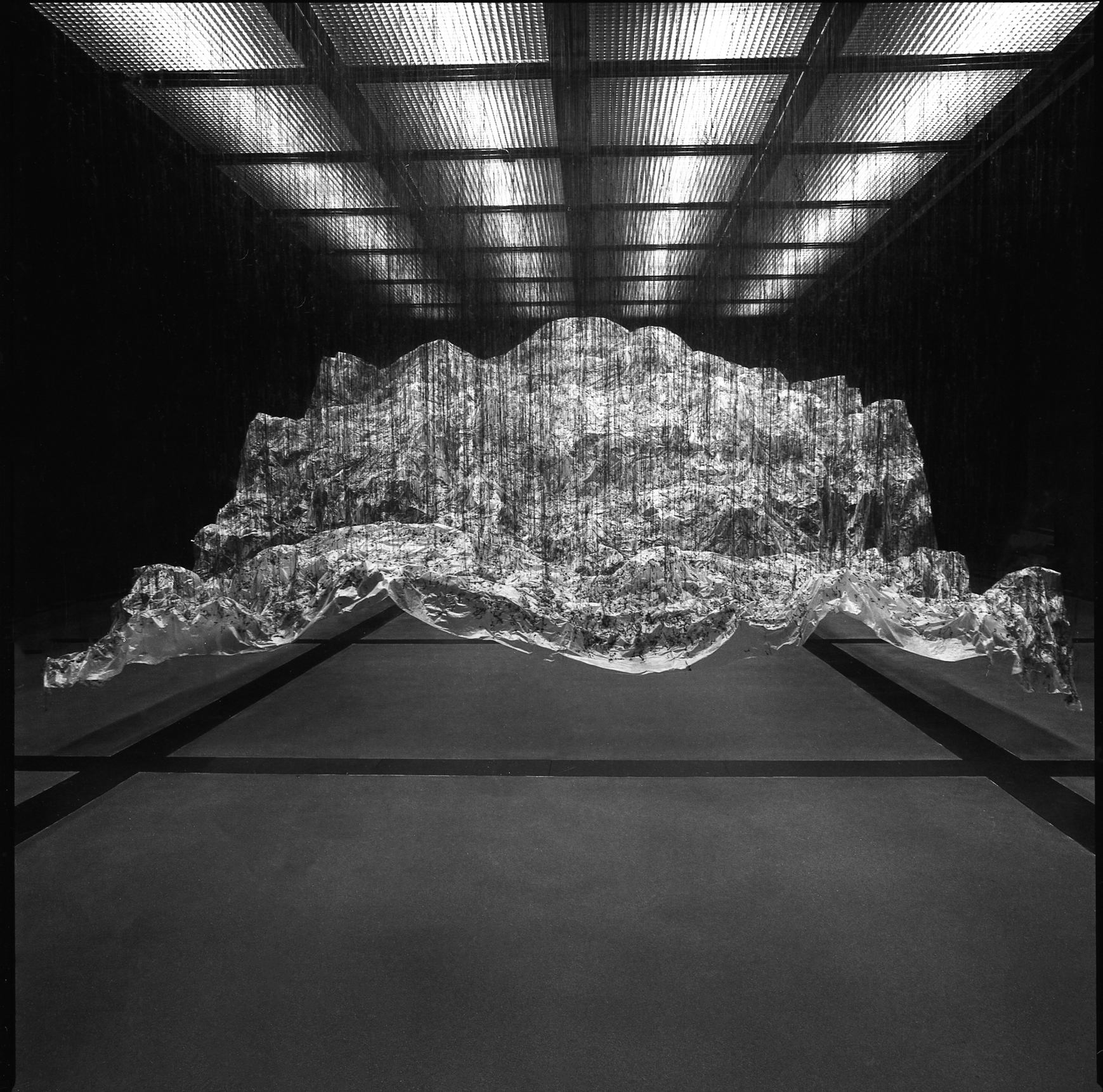 » L’envers du volume : un paysage dessiné par le vide, une empreinte qui devient à son tour une présence… Cette installation monumentale de l’artiste japonais Yasuaki Onishi, réalisée à partir des matériaux les plus simples (une membrane plastique, des coulures de colle noire…), dessine un paysage inversé que le visiteur peut appréhender depuis des points de vue variés, jusqu’à la perte de repères : paysage montagneux ou cavité rocheuse, présence massive ou trace évanescente… Pour définir son processus créatif, l’artiste parle de “capturer l’invisible” : saisir l’empreinte de quelque chose qui a été là, et n’y est plus. Il nous dit quelque chose de la mémoire et de l’éphémère, tant ce paysage si vaste et spectaculaire se révèle infiniment fragile quand on l’approche. Tout en subtilité, l’art de Yasuaki Onishi mêle merveilleusement la force esthétique et la profondeur métaphorique. »