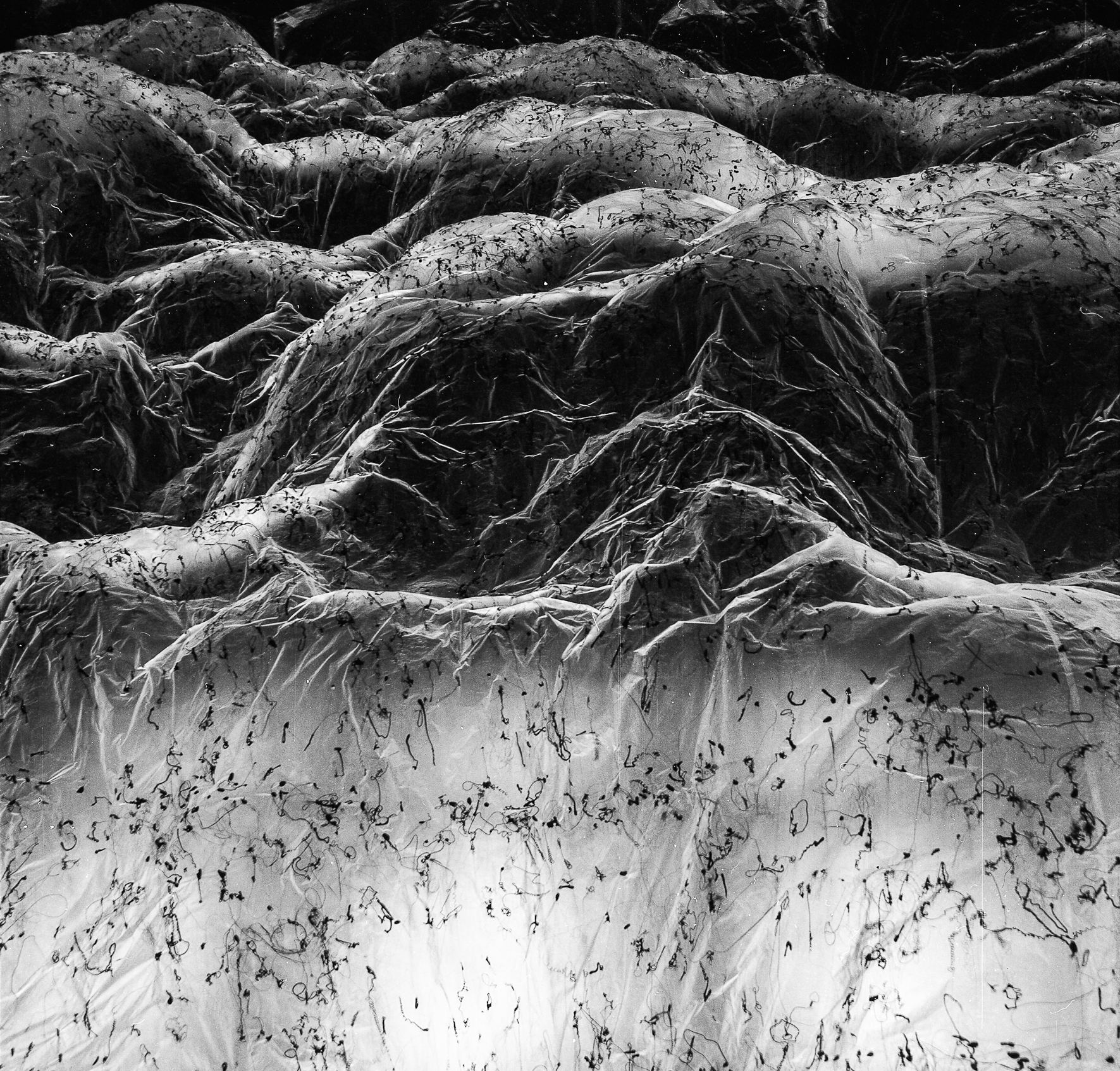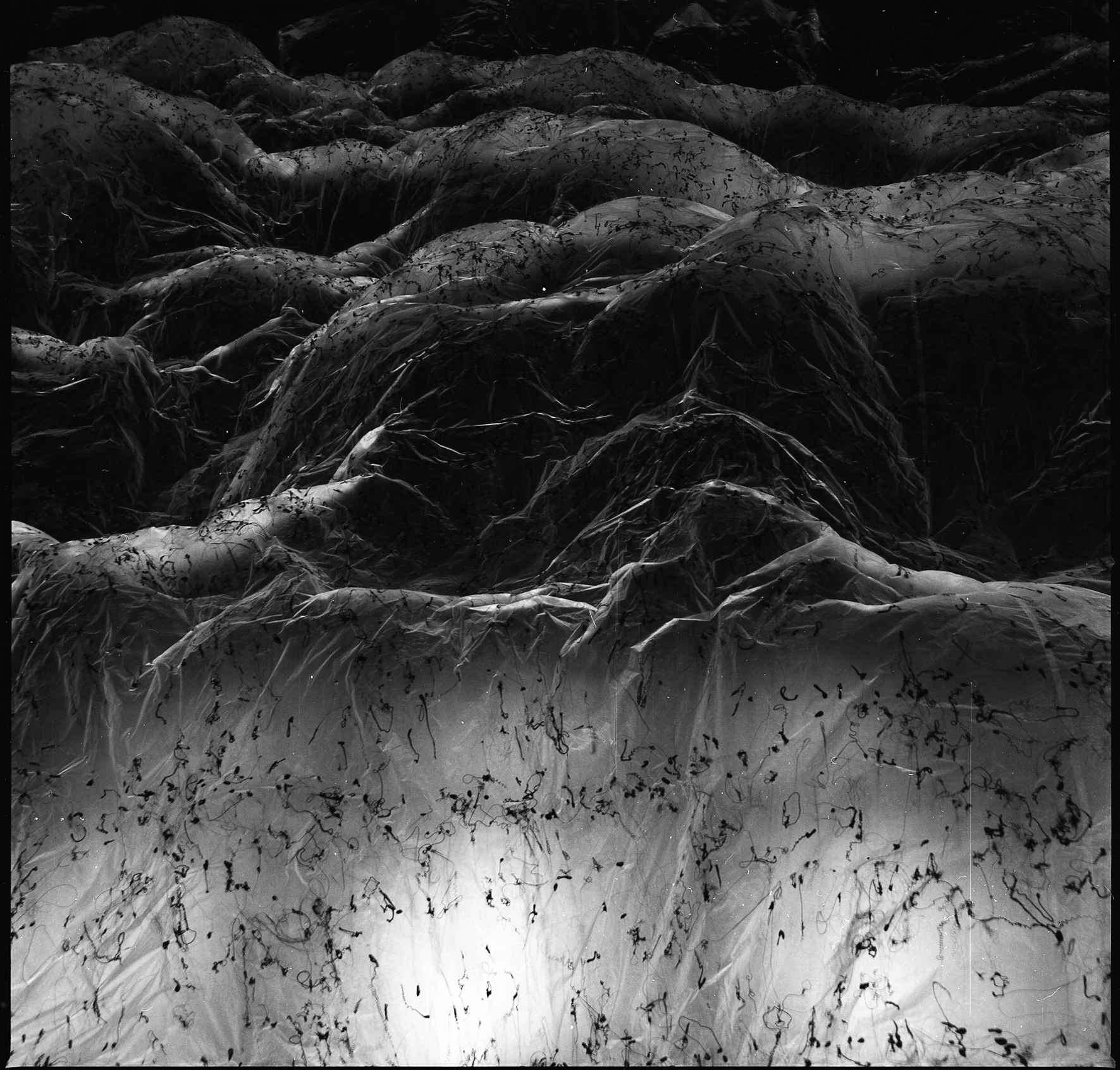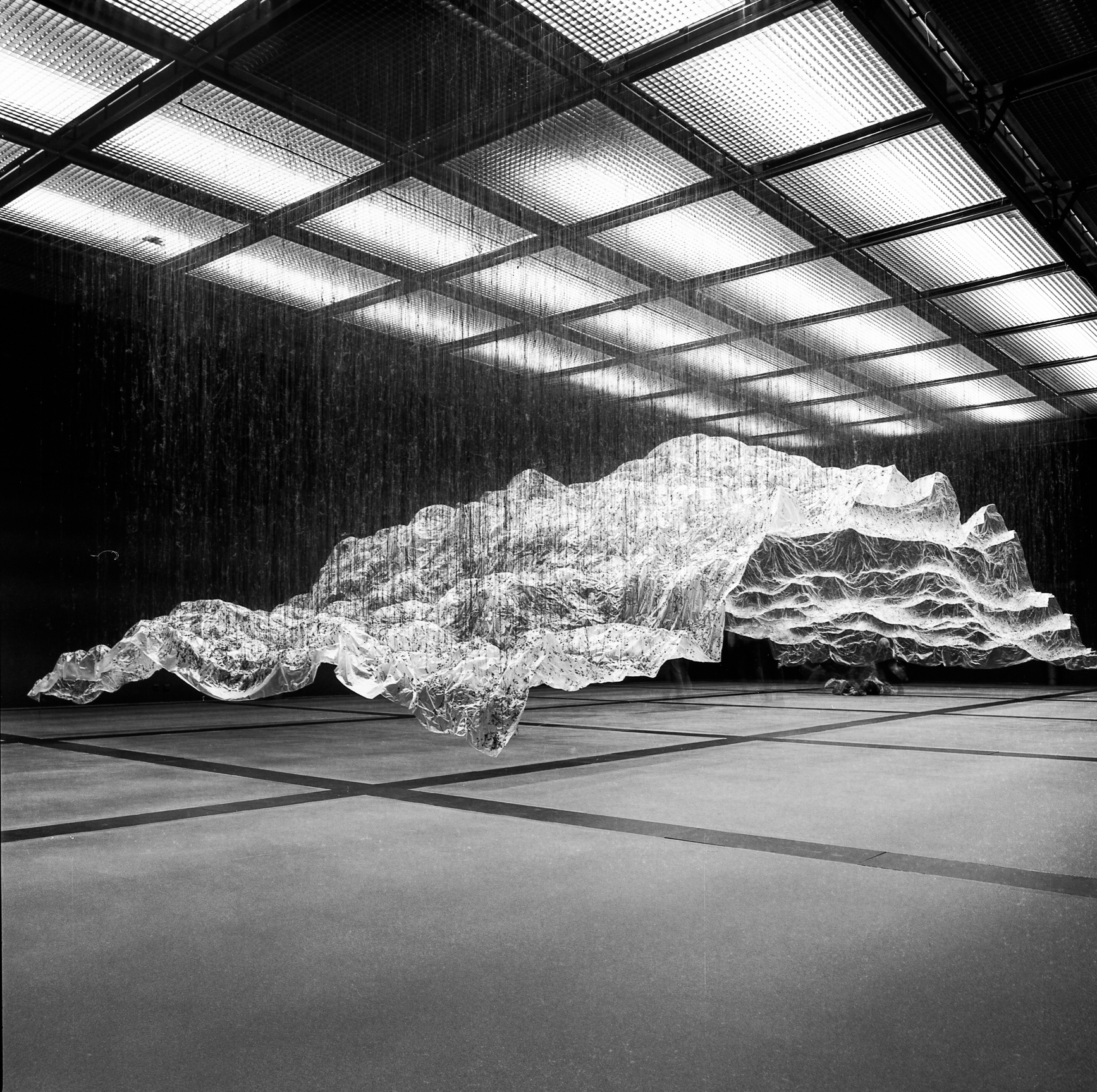 » L’envers du volume : un paysage dessiné par le vide, une empreinte qui devient à son tour une présence… Cette installation monumentale de l’artiste japonais Yasuaki Onishi, réalisée à partir des matériaux les plus simples (une membrane plastique, des coulures de colle noire…), dessine un paysage inversé que le visiteur peut appréhender depuis des points de vue variés, jusqu’à la perte de repères : paysage montagneux ou cavité rocheuse, présence massive ou trace évanescente… Pour définir son processus créatif, l’artiste parle de “capturer l’invisible” : saisir l’empreinte de quelque chose qui a été là, et n’y est plus. Il nous dit quelque chose de la mémoire et de l’éphémère, tant ce paysage si vaste et spectaculaire se révèle infiniment fragile quand on l’approche. Tout en subtilité, l’art de Yasuaki Onishi mêle merveilleusement la force esthétique et la profondeur métaphorique. »